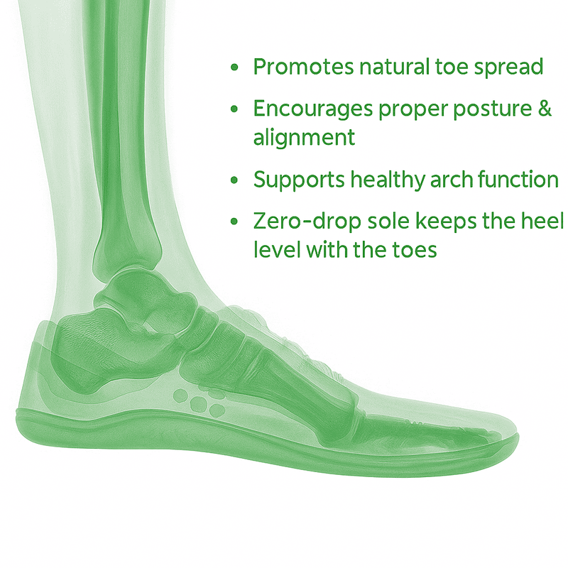 Your feet are one of nature’s most advanced designs — with 26 bones, 33 joints, and over 100 muscles, tendons, and ligaments working in perfect harmony. This complex structure is made for balance, agility, and strength. Traditional shoes often interfere with this natural system by restricting movement and altering posture. Barefoot shoes, on the other hand, are designed to support your body’s original blueprint — letting your feet move freely, build strength, and restore natural alignment.