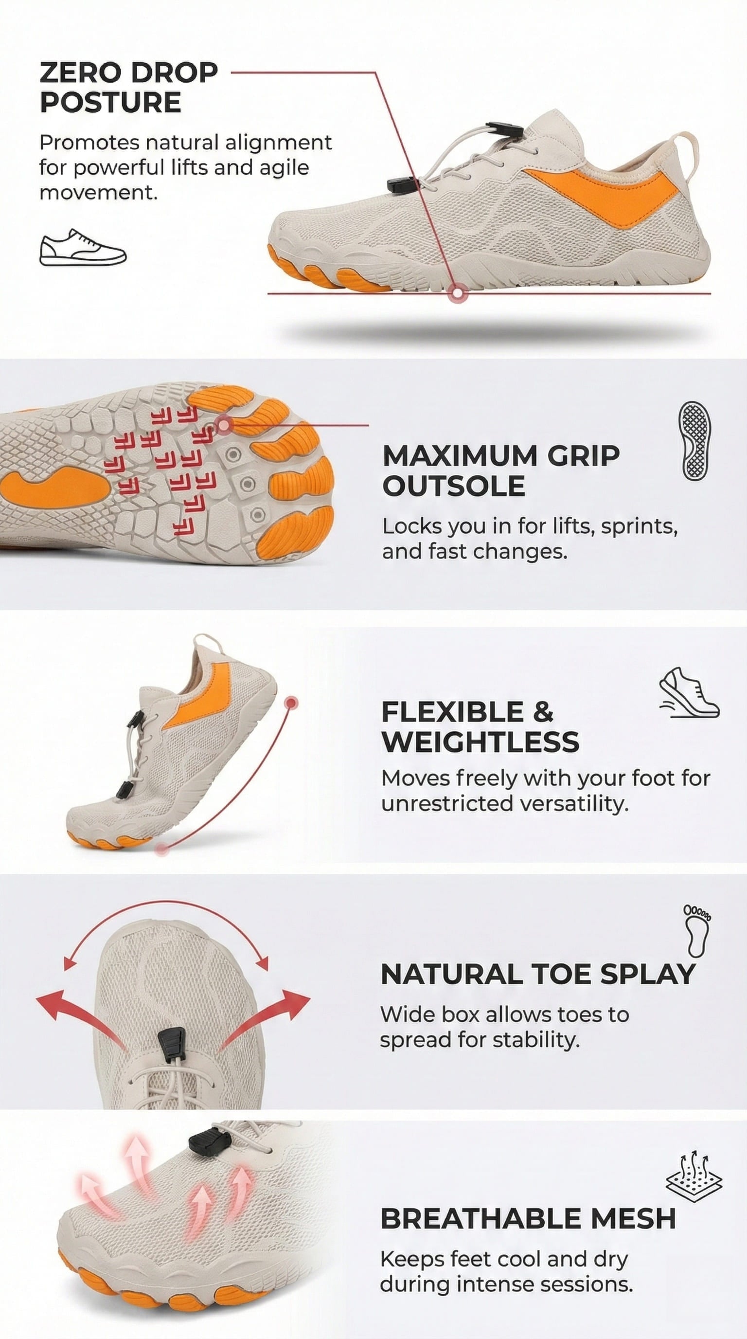 With zero-drop support and natural flexibility, Bareforce Pro’s barefoot design keeps you fully grounded, helping you move with precision and purpose. Designed for both men and women, it delivers the same training advantage to every athlete — improving balance, sharpening form, and fully engaging the muscles that drive performance.