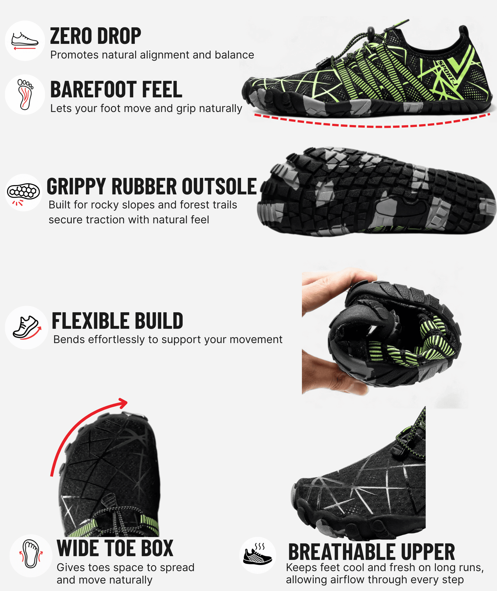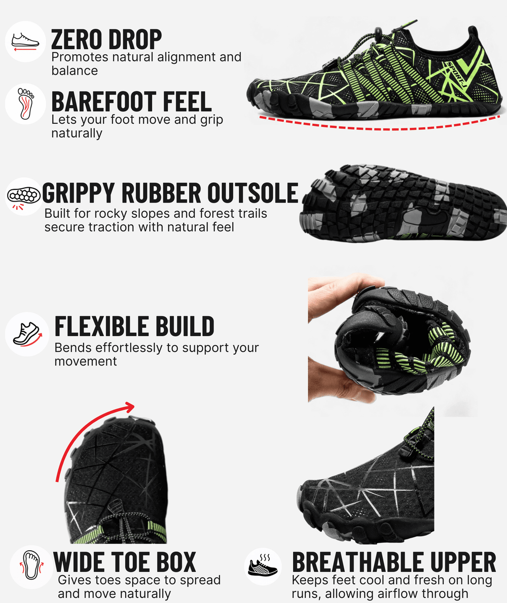 Barevolt is engineered for runners who thrive off-road. Its barefoot build strips away bulk for total ground feel, explosive push-offs, and rapid-fire agility on uneven terrain. No heels to slow you down just raw connection, full control, and relentless momentum. From technical climbs to downhill bursts, you’ll move faster, react quicker, and run harder through every twist of the trail.