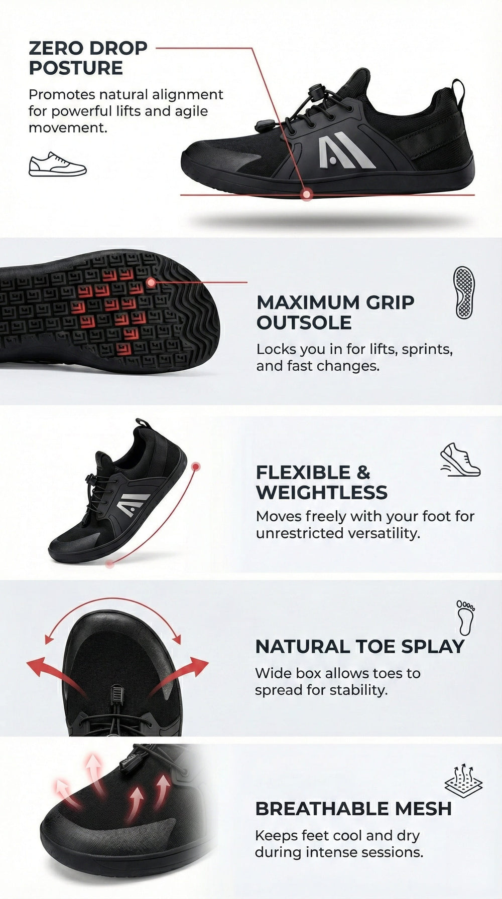 - Zero-drop sole encourages natural toe spread for better stability in lifts and workouts.