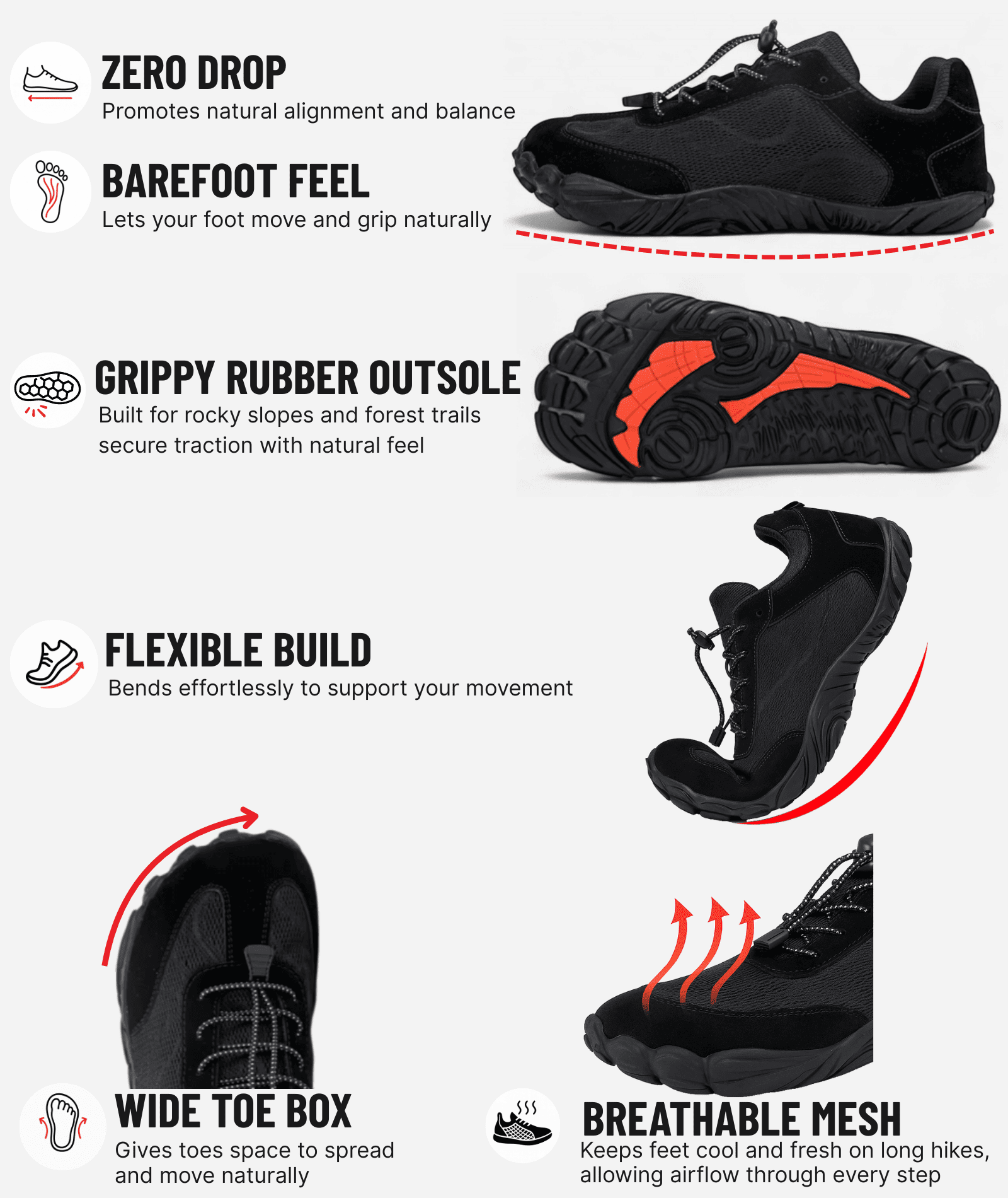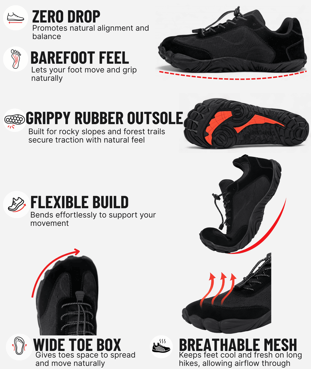 Hiking barefoot-style means moving through nature the way your body was built to. No stiff soles, no lifted heels just natural grip, grounded steps, and full control on every slope, rock, and root. These shoes let you break free from the path and explore real terrain with balance, agility, and confidence