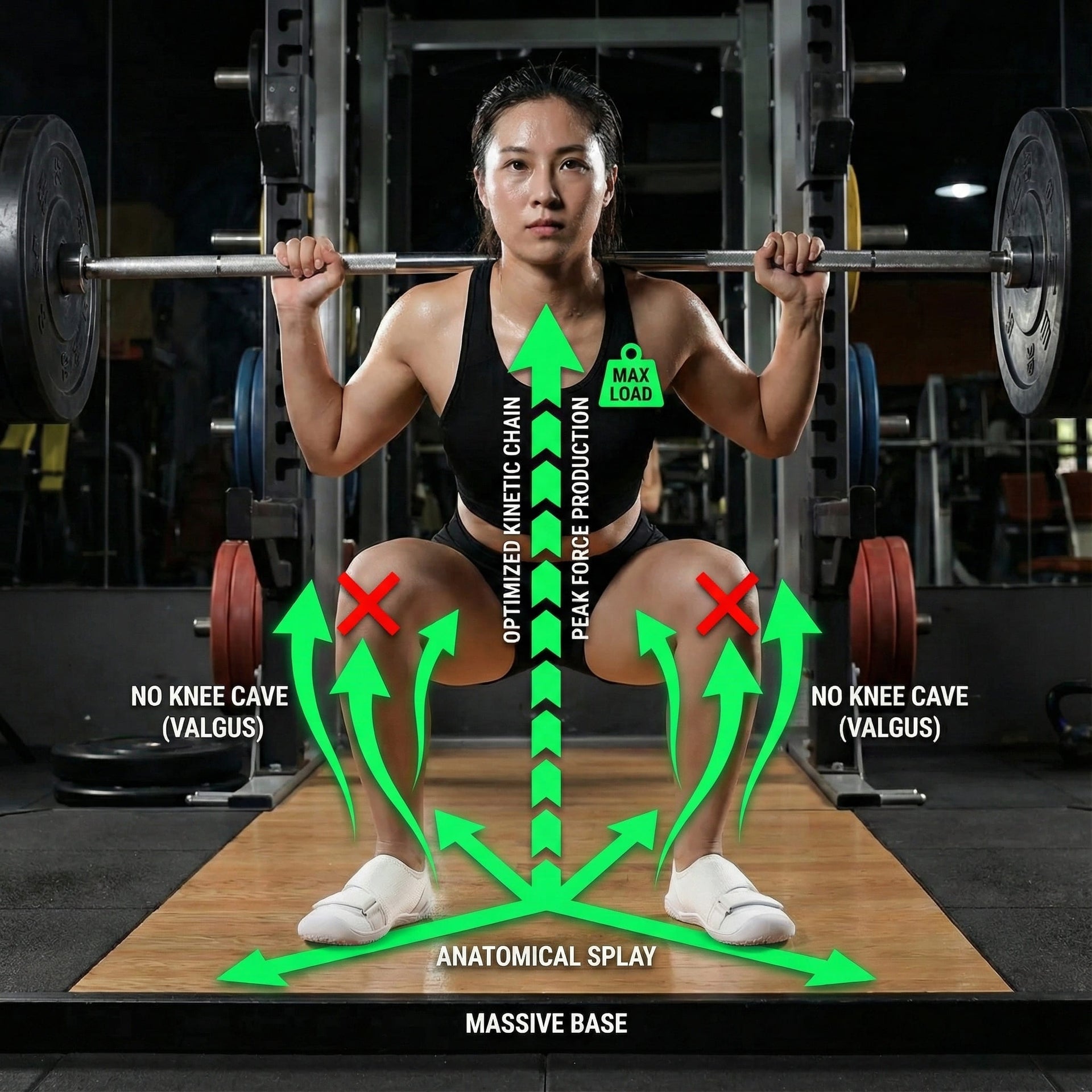 Stop energy leaks during maximal wide-stance maneuvers. By providing high-tensile bracing, the Titan prevents your foot from sliding outward during sumo pulls and deep squats, transforming your foundation into a rigid platform for 100% force production.