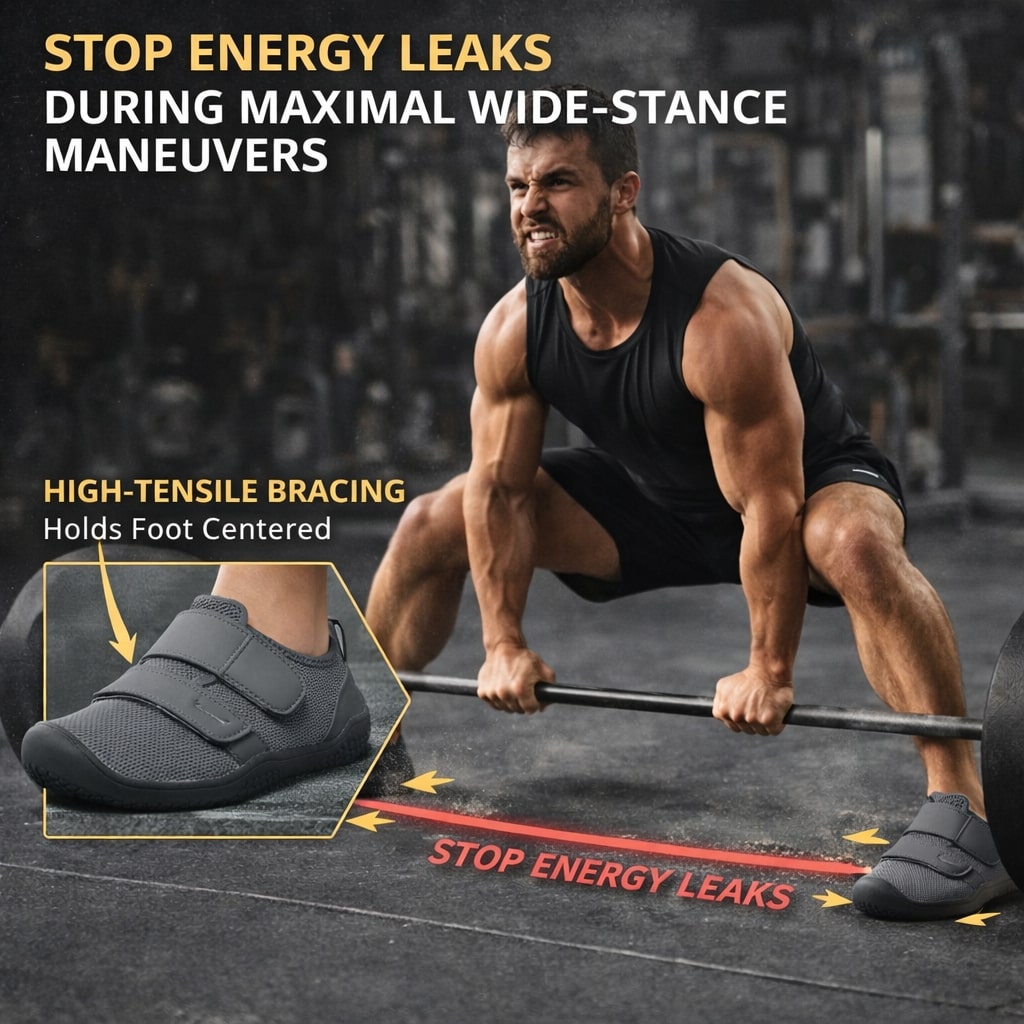 • Dual-Strap Lockdown Security: High-tensile velcro straps "bolt" your foot to the sole, ensuring zero internal slide during heavy sumo pulls or wide-stance squats.